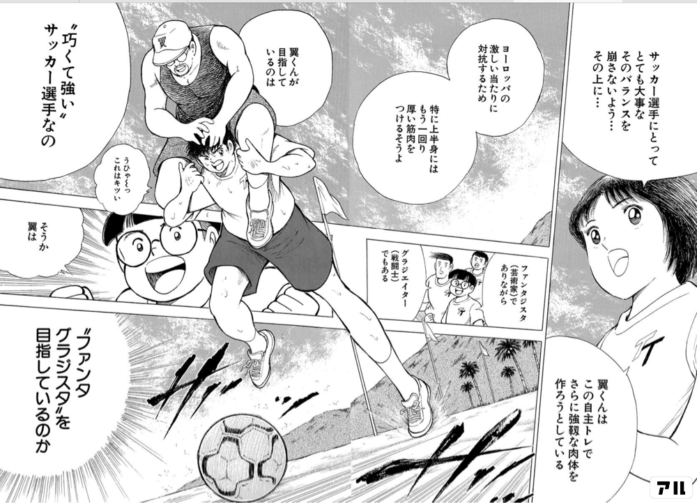 サッカー選手にとって とても大事なそのバランスを 崩さないよう その上に 翼くんはこの自主トレで さらに強靭な肉体を 作ろうとしている ヨーロッパの激しい当たりに対抗するため 特に上半身には もう一回り厚い筋肉を つけるそうよ 翼くんが目指しているのは 巧くて